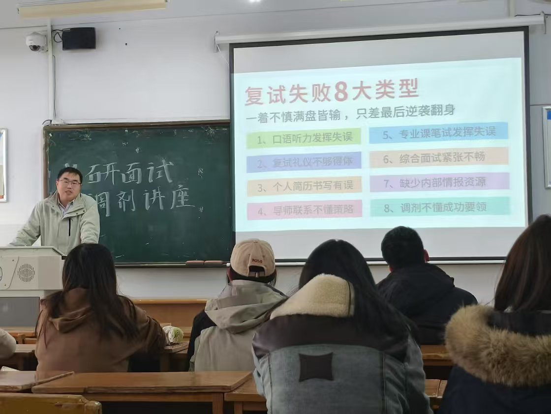 史老师首先列举复试失败八大类型:口语听力发挥失误、专业课笔试发挥失误、复试礼仪不够得体、综合面试紧张不畅、个人简历书写有误、缺少内部情报资源、导师联系不懂策略、调剂不懂成功要领。并从这八个方面展开分析考研复试需要重视的各个细节,深入剖析,引发了同学们的深刻思考。紧接着,史老师以严谨的数据呈现当前考研局势:报考人数持续上扬,录取率逐年降低,调剂竞争愈发激烈。这让考生们直观认识到调剂的紧迫性,迅速集中精神投入学习。对于电话沟通招生办,老师也给出建议,涵盖合适的通话时间、规范的礼貌用语、精准的询问重点等,史老师通过全流程详细讲解,助力考生提升申请成功率。