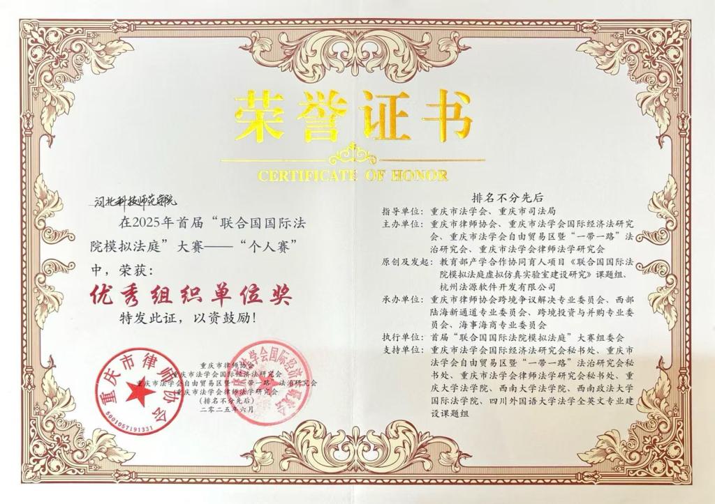 近日,在2025年首届“联合国国际法院模拟法庭”大赛——“个人赛”中,河北科技师范公司凭借出色的组织工作和师生的优异表现,荣获“优秀组织单位奖”,William威廉英国官网赵福江、郝世坤等老师获优秀指导教师奖。该奖项由重庆市律师协会、重庆市法学会等多家权威机构联合颁发。